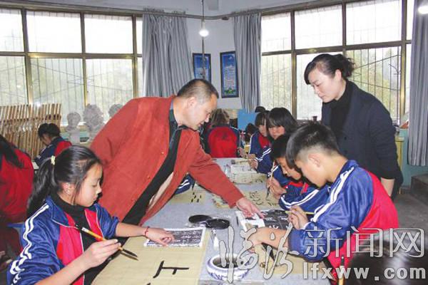 金殿二中校长贾银锁说:“从去年9月份开始,学校开设了音乐、美术、书法(硬笔)、体育(健美操)、物理化学实验操作和阅读6个兴趣活动小组。今年暑假,就读于中国艺术研究院中国书法院研究生课程班的李琰老师提议:书法课程应纳入九年义务教育。紧接着,学校布置教室,购置书法用品,设置专门的书法课堂,投入了大量人力和物力。9月份一开学,学校考虑到农村家庭条件有限,在开设毛笔书法兴趣小组的同时,为初一、初二近20名学生免费提供所有书法用品用具。”