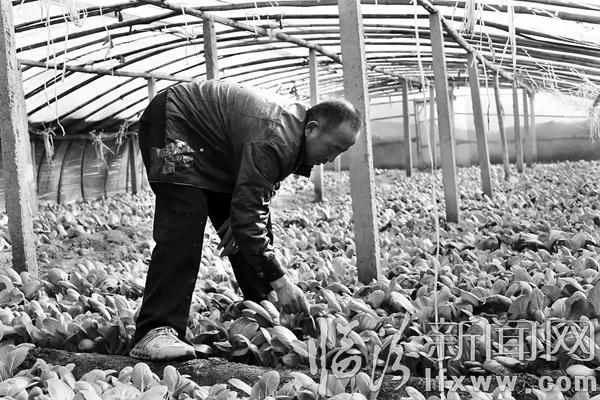临汾新闻网讯 近日, 在尧都区屯里镇西芦村菜农老杨家大棚里绿意盎然, 绿油油的小油菜长势喜人,该批油菜将在春节前上市。图为老杨在棚内管理蔬菜。