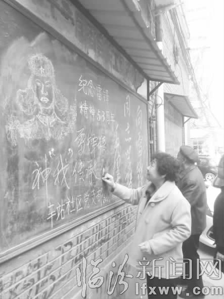 临汾新闻网讯 “学习雷锋好榜样,忠于革命忠于党……”今年3月5日,是毛泽东题词“向雷锋同志学习”53周年纪念日,也是一年一度的“中国青年志愿者服务日”。3月1日,在尧都区车站社区铁路大宿舍小区“学习园地”前,居民郭川娥、孔庆荣同社区工作人员一同忙着书写黑板报,让“雷锋精神”大放异彩。