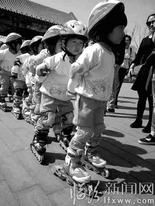 临汾新闻网讯 春光明媚,尧都区莱茵半岛幼儿园组织家长和孩子们在涝洰河公园举行了一场别开生面的体智能展示,引来众多游人驻足观看。图为小一班的孩子们进行轮滑表演。记者 刘静 摄