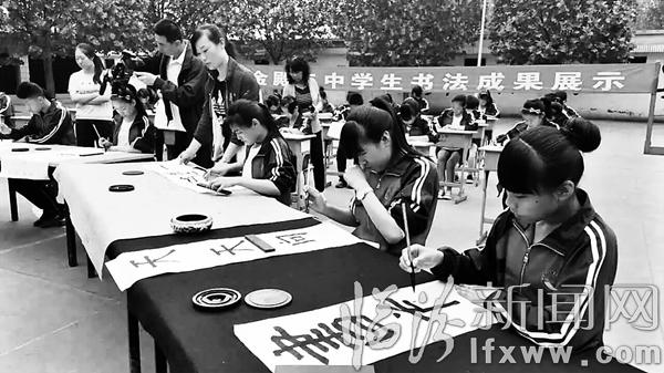 临汾新闻网讯 5月6日下午,尧都区金殿二中第三届校园艺术节在校内国旗台前举行,内容有版面展示、汇报演出、歌咏比赛、乒乓球比赛和广播操比赛等。其中书法、绘画兴趣小组在校内展出其作品,汇报演出则是由书法、读书、体育、绘画兴趣小组表演节目,并有专业老师作为评委点评。校园艺术节极大地丰富了学生的校园新生活,增强了学校的生机和活力,调动了学生学习的积极性和主动性。图为学生们进行现场书法创作。(金殿)