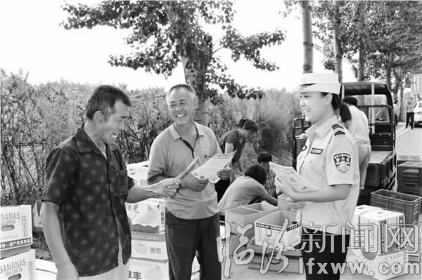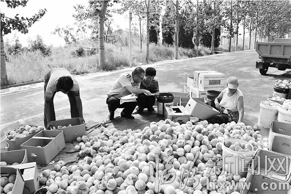 图③为民警耐心地向村民讲解了在道路上占道销售桃子存在很大交通安全隐患。 记者 白洁 摄