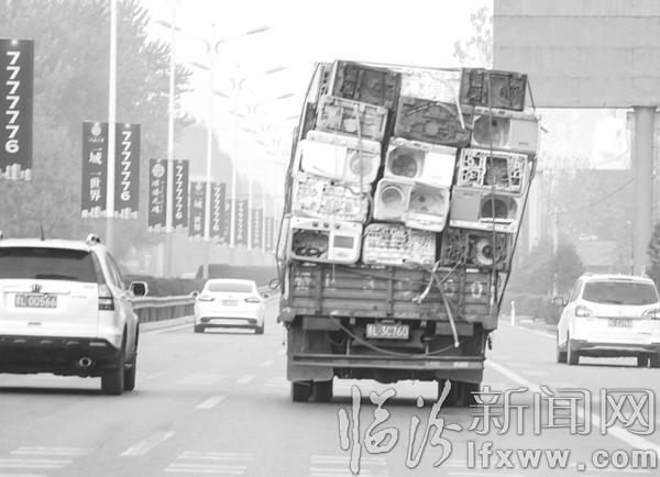 临汾新闻网讯 11月12日,在我市108国道尧都区屯里镇梁村附近,一辆货车载满废旧洗衣机,但由于货物过高向一面倾斜,实在危险。 记者 张蕴强 摄