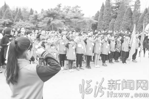 在肃穆的革命烈士纪念碑前,小记者代表郑重地敬献花圈,全体师生静静肃立、低头默哀,随后进行了庄严宣誓,并齐声合唱《我们是共产主义接班人》。此时,临汾晚报小记者、尧都区东关小学学生代表赵思恒呼吁少先队员们继承先烈的遗志,为家乡的建设、祖国的繁荣富强而努力学习、奋发向上。