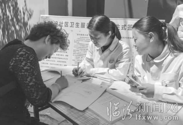 临汾新闻网讯(记者郝海军)“你好,现在咱们市正推进家庭医生签约服务,这是协议书,请看一下……”4月18日上午,尧都区车站街办事处建设社区卫生服务站的工作人员正在给临运小区的居民介绍“家庭医生式服务”的内容,一些居民和该卫生站当即签约。