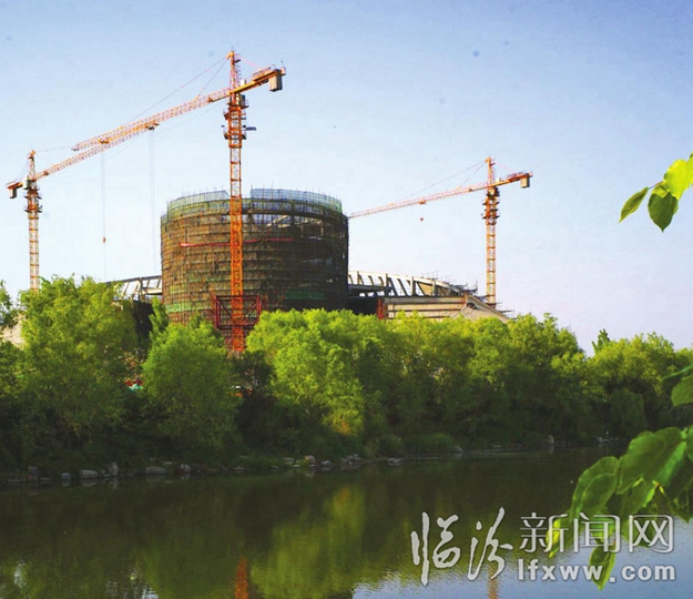 临汾新闻网讯5月8日,天空湛蓝。我市重点工程临汾市图书馆、档案馆在波光潋滟的湖水映衬下,展现出巍峨身姿。据了解,该工程主体已经完成,后期工程正在紧张准备。