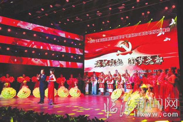 临汾新闻网讯 7月1日晚,临汾市影剧院座无虚席,尧都区“旗帜领航圆梦尧都”庆祝中国共产党成立96周年大型文艺晚会在这里上演。整场晚会,高潮迭起,精彩连连,为党的生日献上了一份贺礼。晚会分为《振兴篇》、《决胜篇》、《和谐片》三个部分,12个精彩节目表达了尧都区干部群众对党的无比热爱,对伟大祖国的深情祝福,展示了尧都人民实现“五个尧都”的坚定决心。