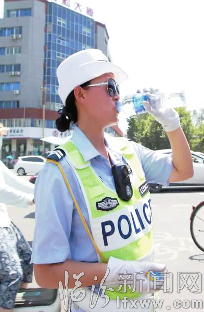 在高温天气下工作,对交警来说,唯一能缓解的只有不停地喝水,但矿泉水在高温下也变成了热水。