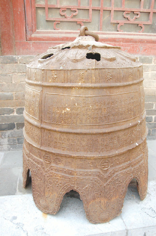 “这口大铁钟声音洪厚清亮,传播距离远,原来悬挂于建筑廊檐下的梁柱上,后来文物修复时保存到这里。”景区工作人员介绍,这口铁钟铸造于康熙五十二年,这一年正好是康熙皇帝的60岁生日,根据铁钟上的16个大字可以判断,既有为皇帝祝寿之意,也有善男信女祈愿国泰民安、风调雨顺的企盼。这口铁钟历经300余年文字依然清晰,可见当时极高的铸造水平,而且钟上的文字对景区当时的文化和历史具有一定的研究价值。”