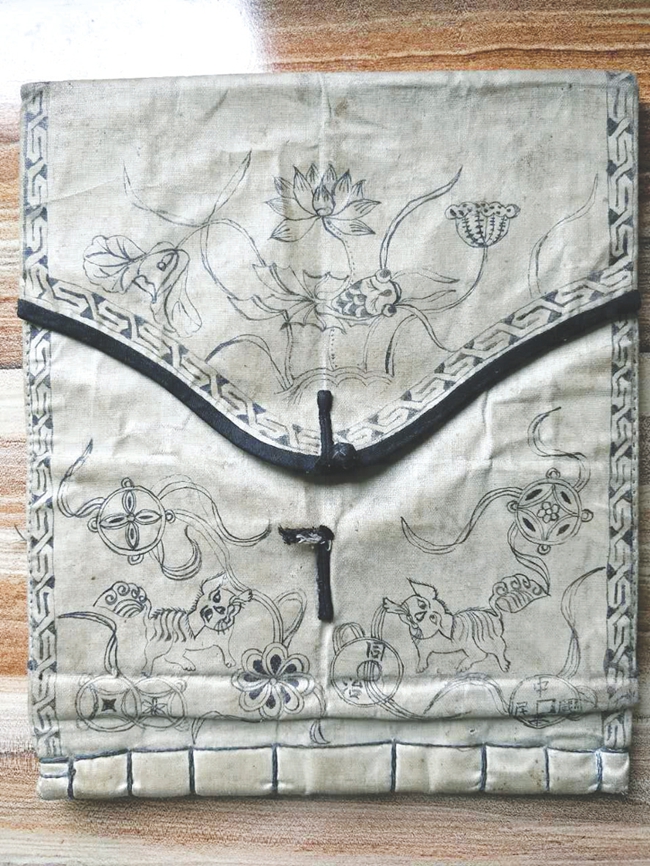 “如果不打开这个账本,一般人都以为这是一个加大型的手工钱包,打开以后才发现,这是一本民国初年的账本。”段延峰介绍,这个账本是一年多前在东关古玩市场买到的,摊主介绍,这是从我市的乡下收回来的,应该是晋南商帮的遗存物。”该账本长27厘米、宽25厘 米。账本外边为护套,护套以白布为材料,上面画着精美雅致的图案。账本边沿为折叠条形花纹,正面为精美的手工绘制图案。图案线条飘逸舒畅,构图精巧别致,莲花、荷叶、水草、金鱼、狮子、绣球等图案栩栩如生,气韵生动,把空白处填补得恰到好处。金鱼穿行其间,眼睛突兀有神,尾部摆动潇洒,神态悠闲自得。下部为狮子滚绣球,两只狮子左右对称而立,一狮子口中衔着绣球,与绣球一起串联的还有钱币,另一狮子口中衔着丝带穿起的钱币,两枚钱币上还有年号,一枚上下写有“同治”,一枚上下左右写着“中华民国”。上下两幅图案笔法一致,既相互映衬为一体,又分别独立。两幅图画工细致,鱼背部的细小鳞片、狮子耳朵上的细毛,清晰而有序,可见画者的细心和认真。