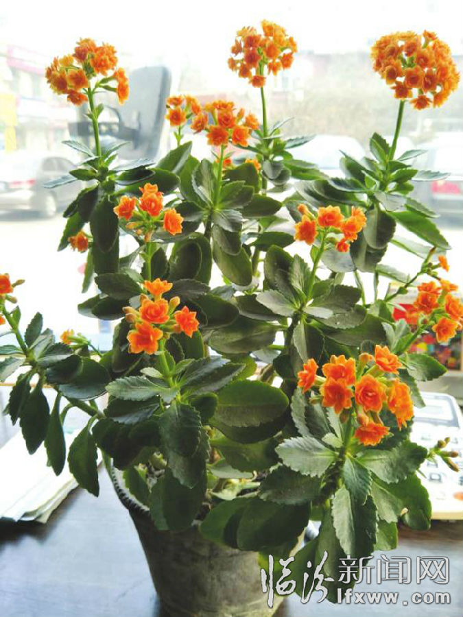 李女士家的长寿花已经栽植多年,每年冬天万花凋谢的时候,长寿花就次第开满了花枝。该长寿花高30厘米左右,叶片多肉,颜色翠绿,橙红色的花儿点缀其间,异常美丽。花枝有十五六个,每个花枝上均次第开满了花,有的花开正艳,有的含苞怒放,有的还是花骨朵儿,最大的一个花枝上开花20余朵。而她养的另外一盆花,不仅颜色不同,而且花序少,开花也少。