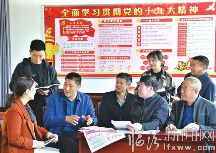 临汾新闻网讯 3月20日,在全国“两会”胜利闭幕之际,尧都区段店乡东王村迅速召开“主题党日”活动,结合本村实际,谋划发展新路子。图为该村党支部书记王秋生(左三)在和党员代表讨论乡村振兴规划。