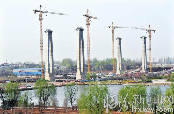 临汾新闻网讯 尧都区尧贤街北沿工程跨洰河大桥作为临汾机场快速通道的控制性工程,全长605.6米,采用三塔双索面自锚式悬索桥,大桥建成后,不仅可以缩短市区到临汾机场的交通时间,对改善城市景观、提升城市品位也有着积极作用。图为3月27日拍摄的工程建设现场。