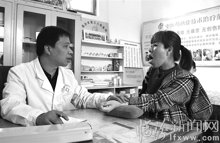 临汾新闻网讯 4月1日,在尧都区段店乡东王村卫生室,村医王国红在为村民把脉问诊。该村卫生室结合当下的中医传统文化适时开展了“中医诊疗”法,开展中医护理,穴位按摩、穴位贴敷、中药薰洗、艾灸、中药温敷等治疗技术,深受患者的欢迎。