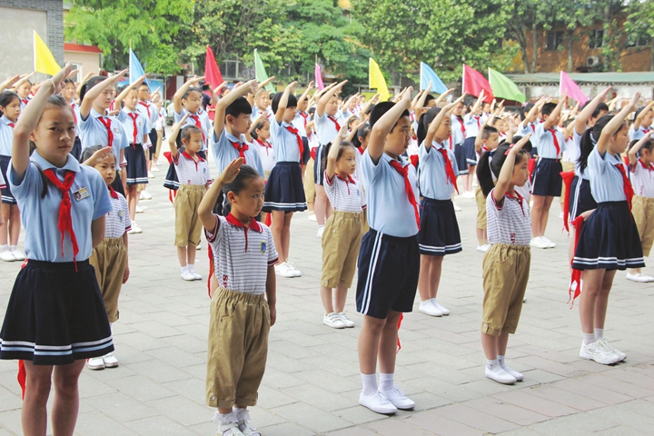 当天,302名一年级学生光荣入队,戴上了红领巾。新老队员在鲜艳的队旗下庄严宣誓,展示出新时期少先队员乐观、积极向上的精神风貌。