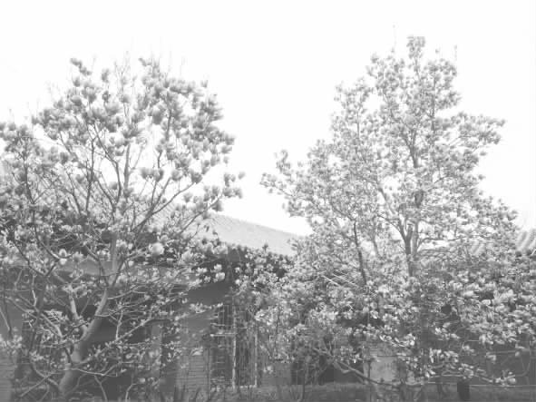 两株玉兰树位于一古色古香的小院内,玉兰花开如钟(形状)。一株树高,吸收的阳光较多,树冠较大,叶子尚未长出,满树的紫玉兰花已竞相开放,顶部甚至已出现花谢的迹象。另一株树靠东,吸收阳光较少,树矮且树冠较小,树上的花朵稀疏,大多已经开花,还有不少花骨朵,而且已经长出了小小的树叶。