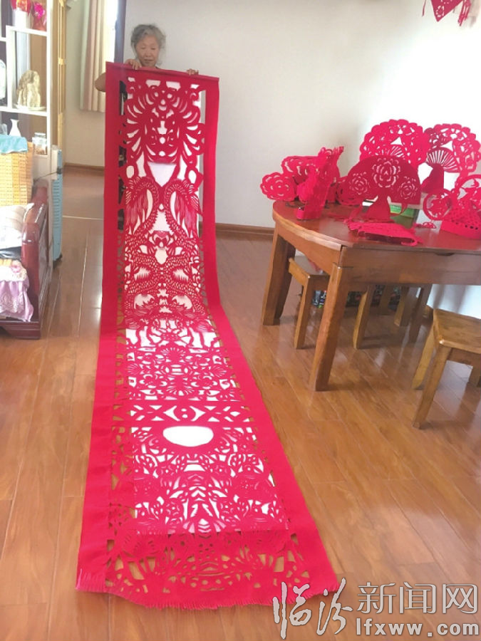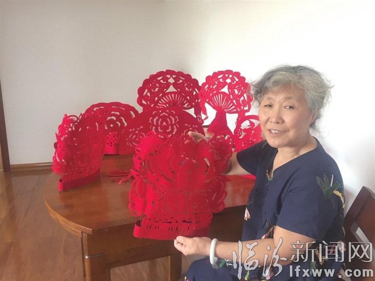 从那之后,韩丽君的“剪纸走秀”一发不可收拾。在2018年6月份的校园文化节中,韩丽君和她的同学们依次披着方巾、穿着“孔雀开屏”等剪纸作品登上了学校舞台,展现民族民间文化剪纸的特殊魅力,赢得了在场观众的热烈掌声。在今年3月份举办的尧都区老年大学20周年校庆上,她们的“剪纸走秀”又一次登上舞台,惊艳程度不言而喻。“当时有关我们20周年校庆的网络视频获得了极高的点击率,正是因为这条视频,我们的‘剪纸走秀’吸引了‘全国第七届老年大学文艺汇演’总导演的关注,我们应邀参加此次比赛,并被指定为开幕式节目。”韩丽君激动地说。