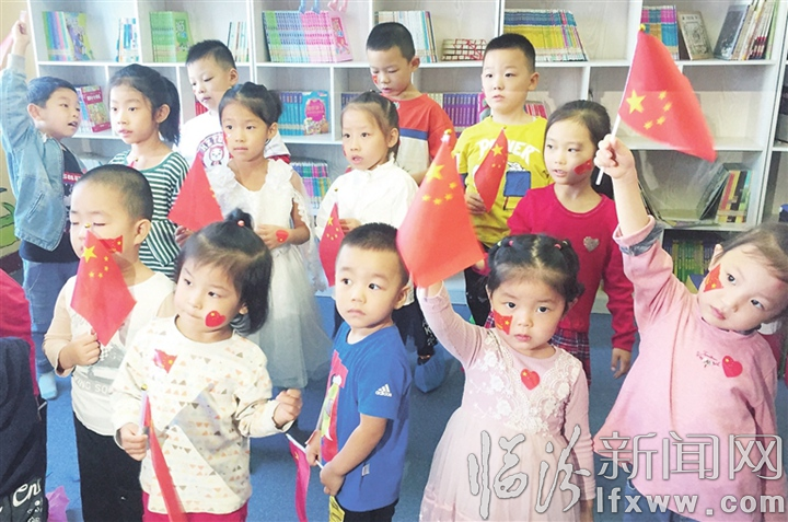 小朋友们手持小红旗,听图书馆工作人员讲解“国庆节”来历。记者 亢亚莉 摄