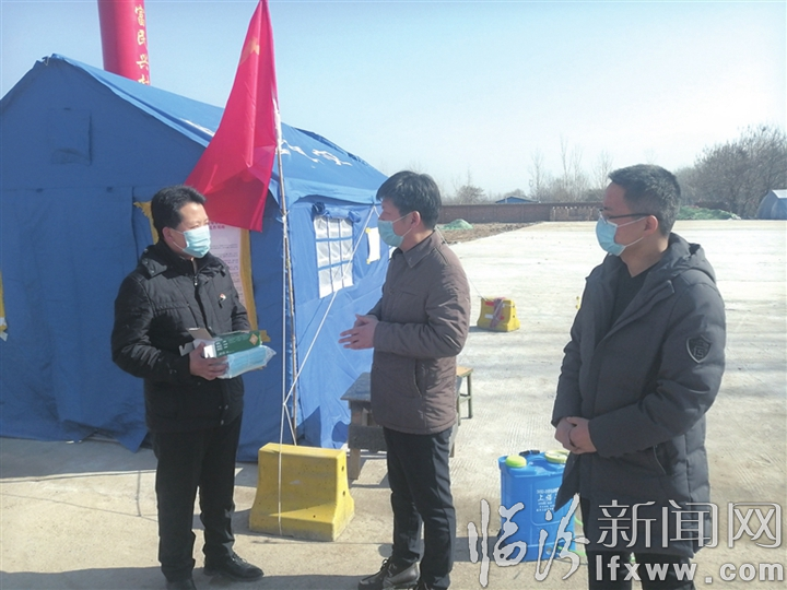 临汾新闻网讯 尧都区乔李镇镇长丁春贵为该镇王村检查点送去口罩和手套。