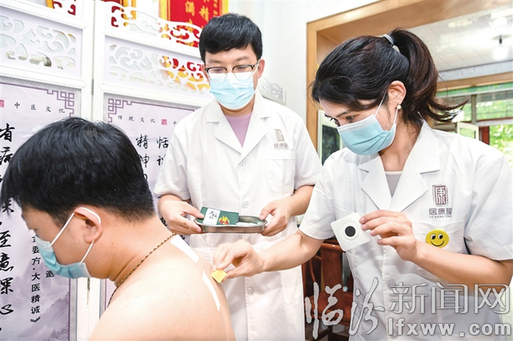 临汾新闻网讯 日前,在尧都区居康堂中医诊所,大夫在为患者贴三伏贴。入伏以来,迎来了冬病夏治的最佳时机,市区许多中医医院、诊所开展了“三伏贴”开贴活动,并举行“冬病夏治”科普讲座,帮助市民树立正确的治病、养生观念,在中医的传统疗法中,达到养生保健、冬病夏治的效果。