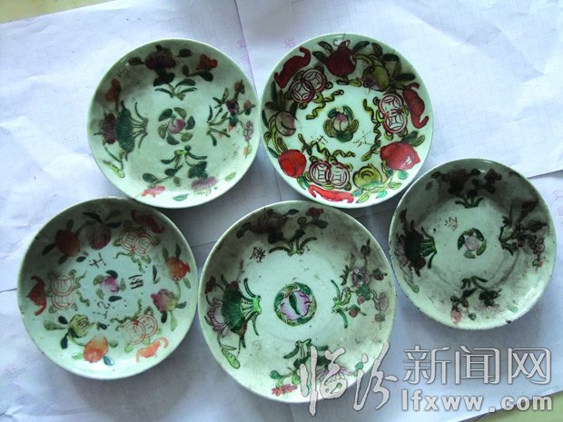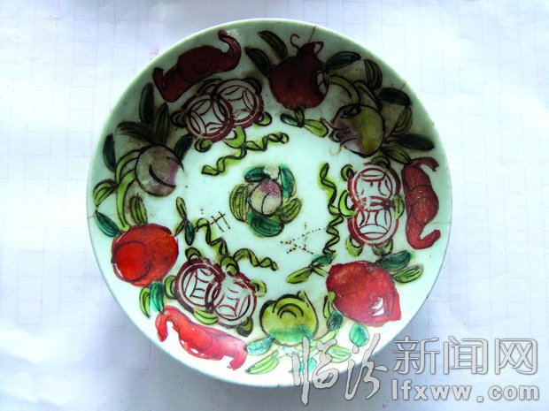 贾师傅在老屋中翻出的瓷器为小碟,共有10余个,直径14厘米左右,每个碟子均保存完好,个别碟子有裂纹。瓷器上有荷叶、荷花、梅花、寿桃等图案组成,每组图案的颜色有红、绿、黄等几种深浅不一的颜色,大多碟子底部的中间为一个寿桃,寿桃中间五六片叶子,寿桃周边有四组图案。在碟子底部有“康熙年制”乾隆年制”“道光年制”同治年制”等清代皇帝的年号文字,也有“余生顺号”商号的文字字样,不少碟子上有人为刻上去的“丙”水”土”文”保”等字样。