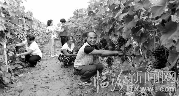 临汾新闻网讯 近日,翼城县里砦镇天马村村民樊技实正在和家人收获葡萄。天马村大力调整产业结构,先后发展优质苹果500亩,发展优质葡萄1000亩,农民收入稳步增加。 记者 李自强摄
