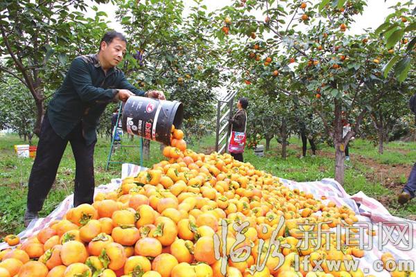临汾新闻网讯 日前,翼城县中卫乡吴寨村村民冯更玉家忙着采收柿子,准备卖给从郑州来的客商。由于他家所产的甜柿即摘即食、肉质松脆甘甜,受到客商青睐,5亩地可收入3万余元。程韵龙 摄