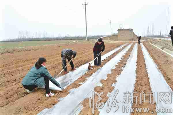 临汾新闻网讯 时值春土豆播种时期,翼城县广大农民深入田间地头深耕、打垄、播种、覆膜,一派春忙。图为该县南梁镇西王村村民正在为种好的土豆进行覆膜。 宋榜娟 摄