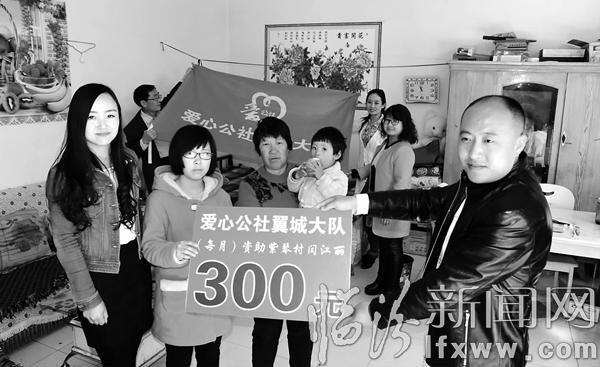 临汾新闻网讯 日前,翼城县“爱心公社翼城大队”成员来到该县隆化镇紫琴村,为父母双亡的闫江丽送上每月300元的爱心捐款。闫江丽目前就读于翼城中学高一,虽然家庭变故,身处困境,但刻苦努力,学习勤奋,她的境况让爱心公社成员感动,大家决定每月捐给她300元,直到高中毕业。
