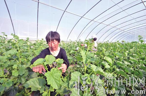 临汾新闻网讯 近日,在翼城县里砦镇村民于保华的大棚里,工作人员正在为甜瓜整枝。据了解,于保华承包了4亩大棚种植绿博特甜瓜,该品种的甜瓜肉质酥脆、口味颇佳,深受消费者欢迎。