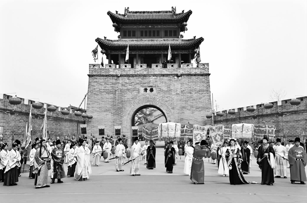 反复地走场练习,让这场彩排已经颇有正式演出的架势了,而实际上,这只是第二天的排练。“其实整场演出从去年下半年就开始策划,从剧本、音乐到服装,每一个环节剧组都和文化、历史界的专家学者多次讨论、反复调整,尽可能还原历史。”邹亚莉说:“前期充分的准备,加上演员们的积极性、配合度很高,让这场彩排进行地相对顺利。”站在10米多高的城门上,俯瞰彩排现场,伴随着庄严肃穆的音乐声梦回大明。历史上,李娘娘是明穆宗朱载垕的皇妃,明神宗朱翊钧的生母。关于李娘娘的传说,在翼城县可谓家喻户晓。传说,李娘娘在一次回乡省亲时,遇到了两位喜结连理的新人,不料新人的轿子挡住了娘娘回乡的路。当得知新娘和自己同乡时,李娘娘不仅没有怪罪,还为新人送上祝福,赏凤头鞋、霞帔、龙凤轿等让新娘风光出嫁。“老百姓认为李娘娘是个爱民如子的皇妃,还是一位教子有方的母亲,所以很受翼城人民的爱戴。”城内村村委会主任魏利权这样说,“结合李娘娘的故事,我们准备了这个实景剧,并以此为契机,大力打造以‘同圆古城梦’为主题的城内村第五届民俗文化旅游节,让文化旅游节载体更加丰富,节目更加精彩。”翼城县唐兴镇城内村民俗文化旅游节自2013年启动以来,一届一个新主题,一步一个新台阶,已实现了从“重启记忆、追梦古城到圆梦古城”的跨越。今年,城内村南十字街区开发建设被列为重点旅游开发项目,一批批文物遗产相继重建与修缮,让魏利权对古城发展文化旅游更加充满信心。尽管有“恐高症”,几天的彩排,魏利权还是每天都要踩着梯子“爬”上城门看彩排效果。魏利权介绍说:“台下的演员大部分都是城内村的村民,而且是义务演出,有时候还冒着雨排练,看着他们为家乡尽心尽力地付出,我特别感动。”除了城内村的村民积极响应,剧组还通过电视、微信等形式招募了一批文化志愿者,马雪泽就是其中之一。马雪泽说半个月前,她在微信上看到《李娘娘还乡》招募演员,热爱表演的她立刻报名参加,经过试角,被安排出演“媒婆”一角,但她却担心自己经验不足,影响排练进度,所以选择“退位让贤”。“新选的‘媒婆’多次在庙会扮演过类似的角色,确实更容易上手表演。”从主要演员到没有一句台词的城门卫兵,尽管觉得遗憾,但马雪泽还是坚持演了下来。“我服从剧组的一切调配安排。”马雪泽穿着戏服说出这句话时,俨然有一种守卫的坚毅和不服输的精神。今年52岁的她家住唐兴镇陵下村,距离城内村五公里,为了节省时间,她每天自费打车来到排练现场,家里的窗帘生意也放下了,在别人眼里的“不务正业”,在她看来却是值得的。