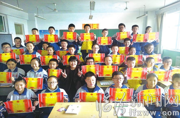 开学之初,常芳依据每个同学的优点给他们每人写了一张奖状,并与同学们合影。