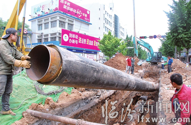 临汾新闻网讯 为改善民生、推进城市建设,翼城县委、县政府实施了集中供热项目。目前,项目建设如火如荼,城区绛源路、八一路、翔翼大街、三中路、唐霸大道和南环路6条道路同时开挖敷设。图为7月5日,在翼城县红旗街和绛源路交叉口,工人们正在安装供热管网。