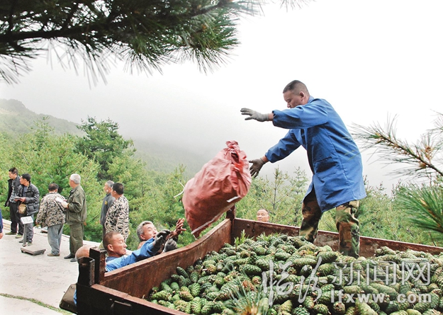 临汾新闻网讯 近日,在翼城县西闫镇大河村,村民们在装载松果。眼下正是松果成熟的季节,西闫镇今年预计能产松果500万公斤,村民采摘松果每公斤劳务费1元左右,每人每天可增收约200元。