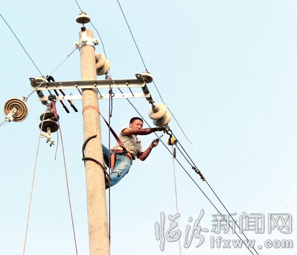 临汾新闻网讯 近日,永和县电力部门的工人在阁底乡阴德河村更换高压线路。该线路更换投运后,将为村民用电提供有力保障。记者 孙国芳摄