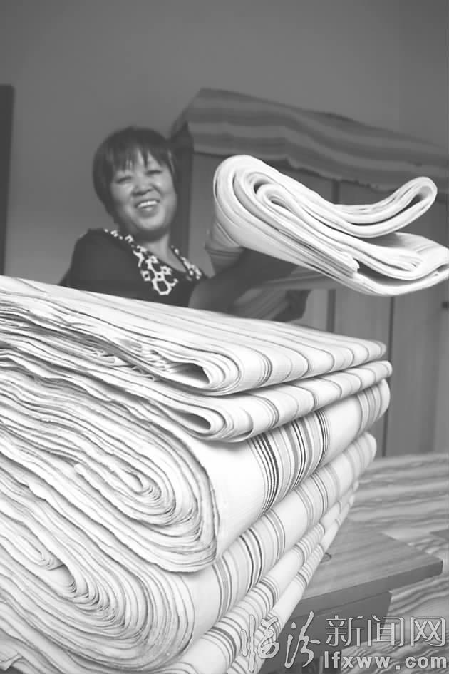 一位妇女展示晋南土布成品。