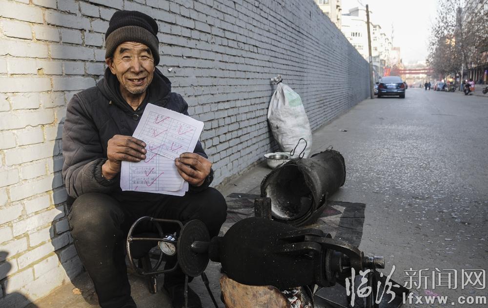 “能干就多干点,不给子女增添负担。”乔师傅说,他今年67岁了,是尧都区大阳镇北帝村人,膝下一儿一女,十分孝顺,但是他热爱这个行当,每天9时许开始出摊,走街串巷,没有固定的经营场所,收入还不错,一天下来大概能百八十块钱,足够他和老伴生活。“2016年我和老伴都生病住院花费了一万多元,国家政策好,农村医疗报销了四千多元,没跟孩子要一分钱。”乔师傅自豪地说。
