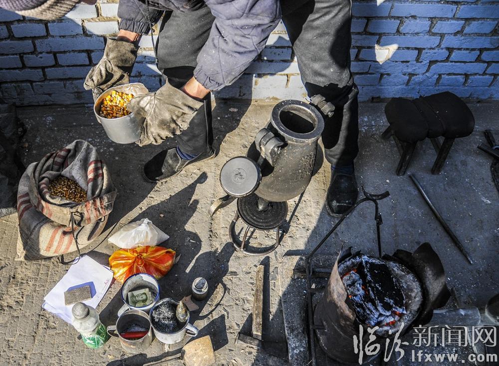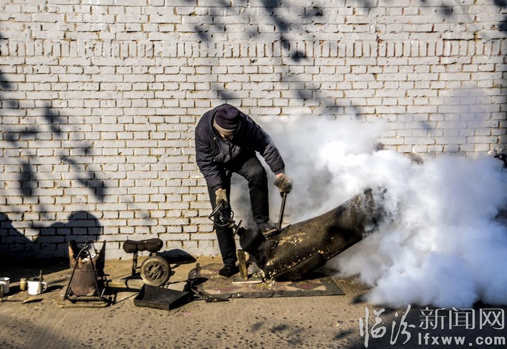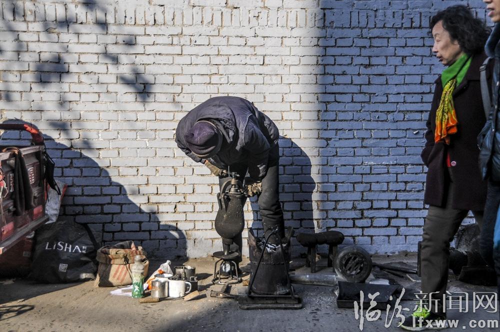 1月12日,尧都区印染巷中段十字路口,老行当手艺人乔师傅又开始了新一天的生活。一辆推车、一团炉火、手摇吹风机、一口葫芦状的爆米花机,这是乔师傅每天出门必带的家当。