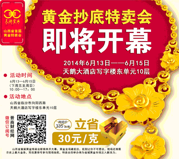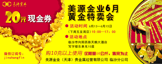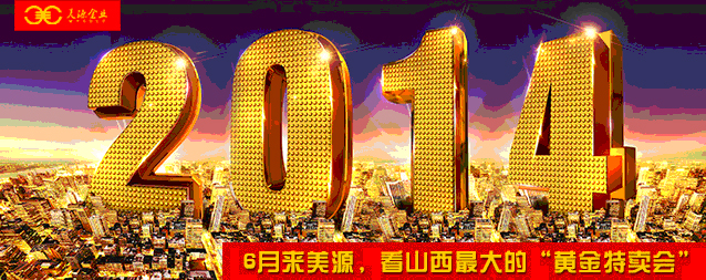 2014年6月13、14、15日,美源金业为回馈新老客户,特在临汾市向阳西路天鹅大酒店写字楼东单元10层举办“黄金特卖会”,底价特卖三天,在此基础上总价再次现金减免,优惠前所未有,购买热潮火爆来袭!