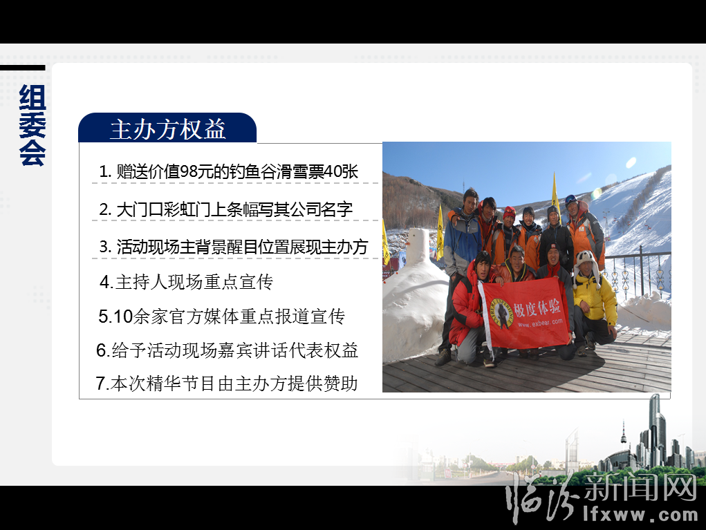发布时间:2015-01-14 09:48:10 滑雪文化公益演出即体现了“民土民情”“文化艺术”一体的“滑雪文化体育娱乐”又给旅游业带来经济效益和社会效益;