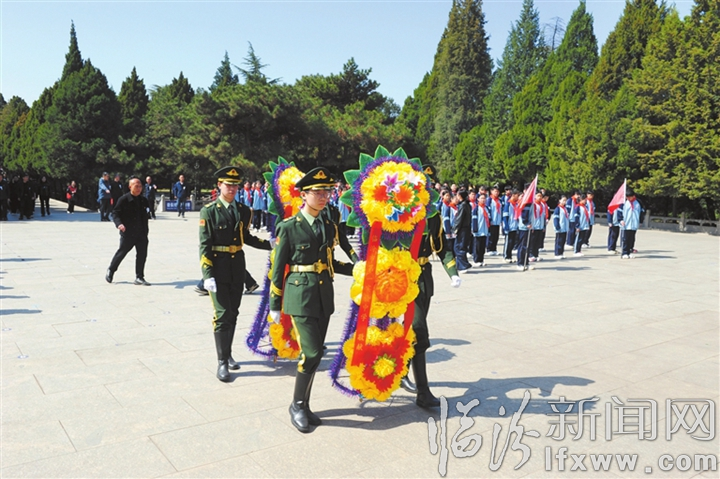 4月1日上午,临汾市第一实验中学组织师生前往临汾烈士陵园,开展“清明祭英烈 青春担使命”祭扫教育活动。图为该校国旗班成员向革命烈士敬献花篮。