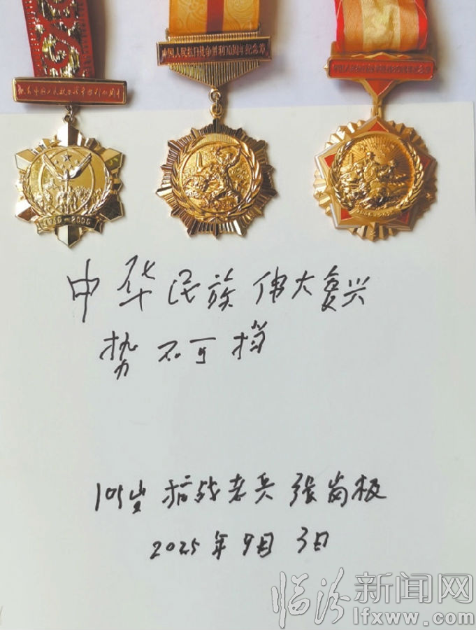 9月3日早上,张岗极让孙女将三枚纪念章端端正正地佩戴于胸前,早早坐在电视机前,等待观看在天安门广场举行的纪念中国人民抗日战争暨世界反法西斯战争胜利80周年大会和阅兵仪式。当激昂的音乐响起,看到一个个整齐的方队迈着坚定的步伐走过,他的眼中闪出了泪光,仿佛又回到了那个战火纷飞的年代。张岗极百感交集,郑重写下“中华民族伟大复兴势不可挡”12个字。下笔虽略显颤抖,却是苍劲有力,这是他对烽火岁月的缅怀,对牺牲战友的思念,更是对后辈们勿忘历史、赓续前行的殷殷嘱托。张岗极用自己的一生验证了一名抗战老兵的忠诚与担当,为红色苏寨留下一份珍贵的精神财富,成为了苏寨村众多荣光者中的一员。他始终坚守的家国情怀、矢志不渝的革命信念永远是激励后来人铭记历史、立志成才、报效国家的精神力量。(图片由受访者提供)