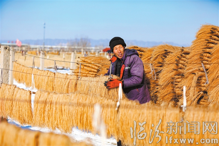 临汾新闻网讯 1月6日,襄汾县南贾镇南刘村村民在晾晒红薯粉条。眼下正是粉条加工的黄金时节,当地村民抢抓晴好天气,忙着加工、晾晒红薯粉条。一排排粉条挂满晾架,在冬日暖阳照耀下晶莹剔透,与美丽田园乡村汇成一道亮丽风景线。