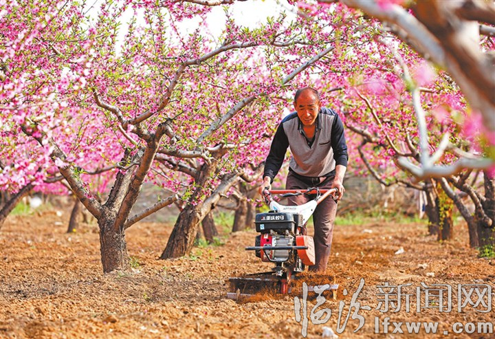 临汾新闻网讯 日前,襄汾县新城镇南村的300余亩桃园进入盛花期。当地农民抢抓农时,对桃园开展除草、疏花、授粉、追肥、灌溉等系列田间管护,为今年桃果丰产提质打下坚实基础。图为农民在对桃园开展除草作业。