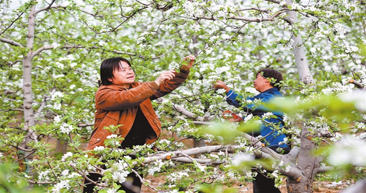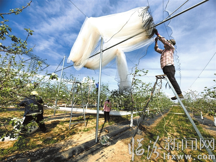 临汾新闻网讯 眼下正是苹果树开花期,也是进行浇水施肥、花前修剪、疏花疏果的关键阶段。在大宁县曲峨镇白村宁脆苹果园,果农正在架设防雹网、开展果树修剪作业,为苹果丰收打好基础。