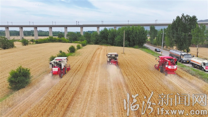 临汾新闻网讯 5月28日下午,一台台小麦联合收割机行驶在侯马市上马街道办事处南张里村的金色麦浪中。当日,侯马夏收正式开镰。