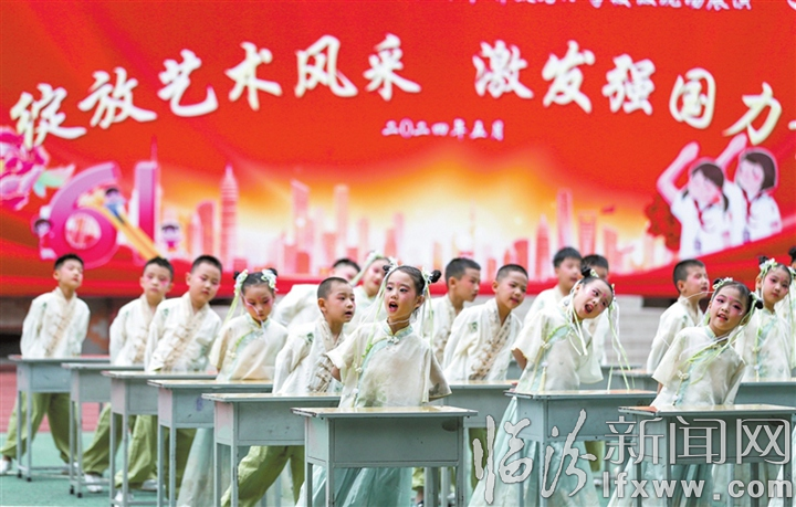 临汾新闻网讯 5月30日,临汾市解放路小学举办庆“六一”小学生艺术节展演活动,让孩子们在吟诗诵词中传承中华经典,在情景剧中展现文明礼仪,在节日中收获成长的快乐。图为该校“吟诵艺术亲子社团”学生正在吟诵《诗经》篇章。